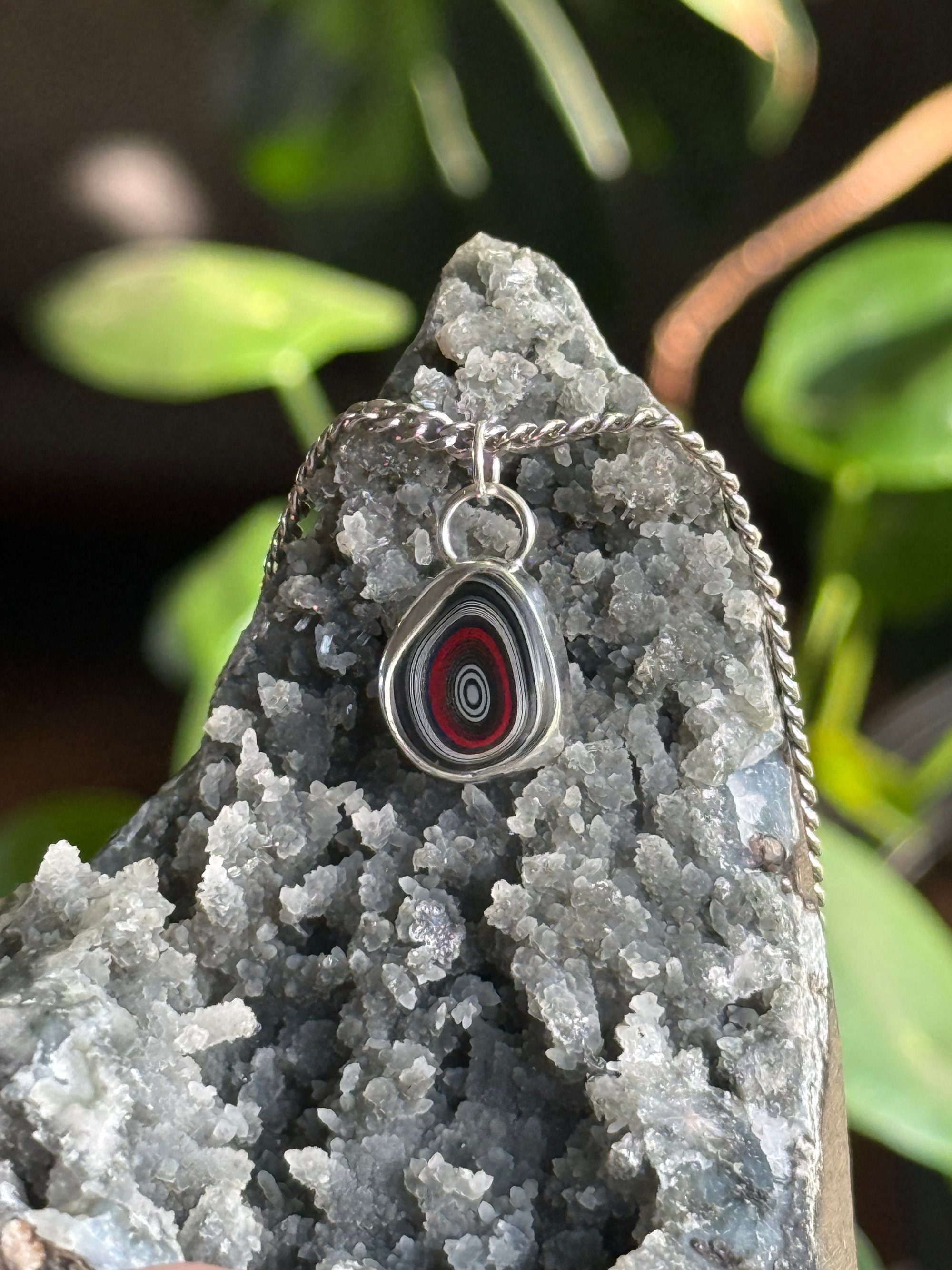 Detroit Agate/Fordite set in silver. Detroit Agate or Fordite, is a rare material composed of cured, layered automotive paint overspray from automotive factories. Yes, you read that right… it’s primarily from the 1940s to 1970s factory drip. Vroom vroom!! Your good luck driving charm!!